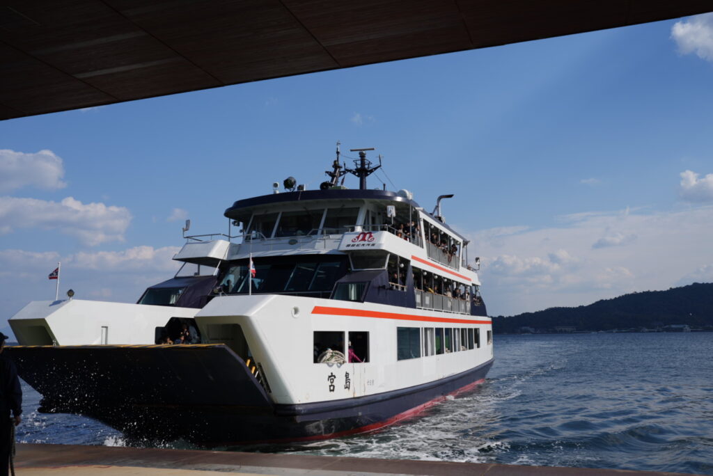 宮島へは、写真のフェリーに乗って約10分。乗り場には改札があって、感覚としては「電車に乗る」みたいにスッと乗船できるのが、なんだか面白いんですよね。