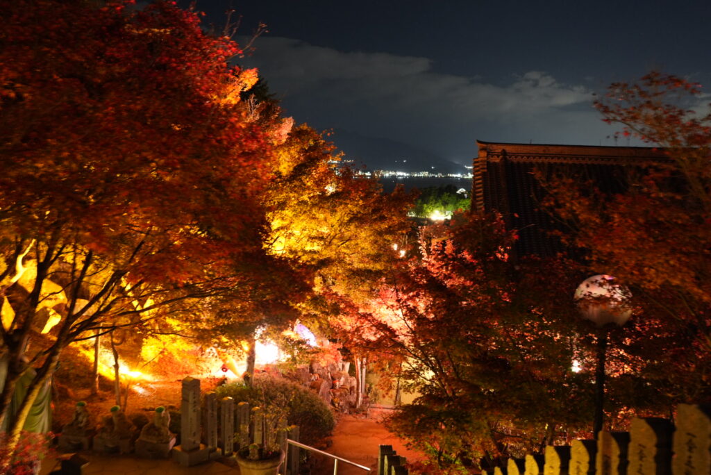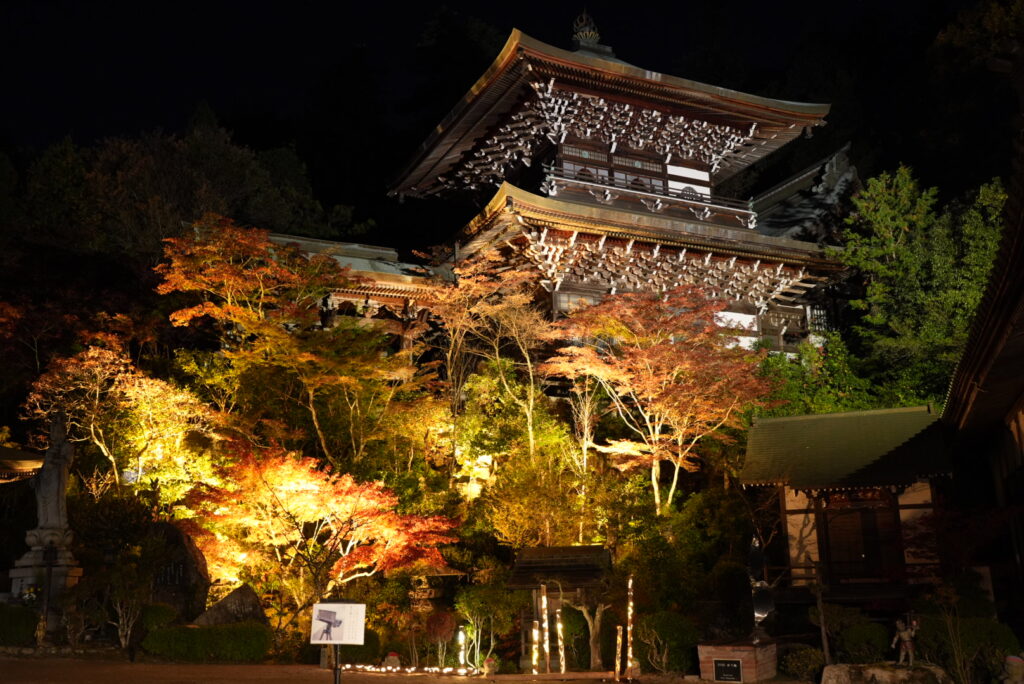 お昼にも来たところなのにまるで別世界のような感じです。暗がりの中でライトに照らされた紅葉を見ていると、きれいだな〜って思う反面、どこか妖しい雰囲気もあって。気を抜いたらそのまま迷い込んでしまいそうな、そんなドキドキとワクワクもちゃんと味わえました。